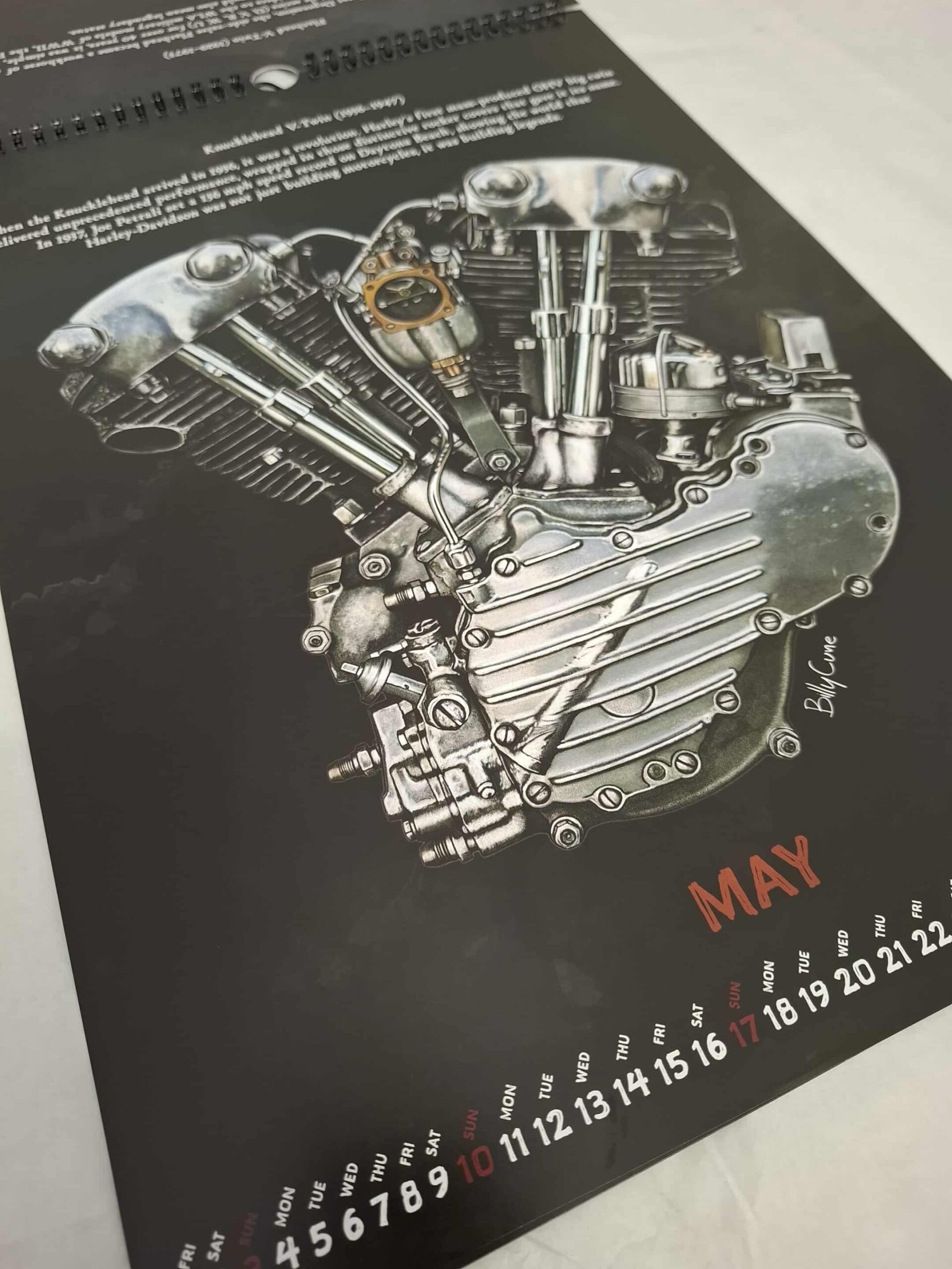W środku kalendarza znajdziesz 12 oryginalnych rysunków silników inspirowanych legendarnymi motocyklami Harley-Davidson, każdy z niezwykłą precyzją, pasją i dbałością o detale. Każda ilustracja została wykonana ręcznie przez polskiego artystę, z najwyższą troską o oddanie ducha klasycznych silników — od najwcześniejszych konstrukcji po nowoczesne Milwaukee-Eight.